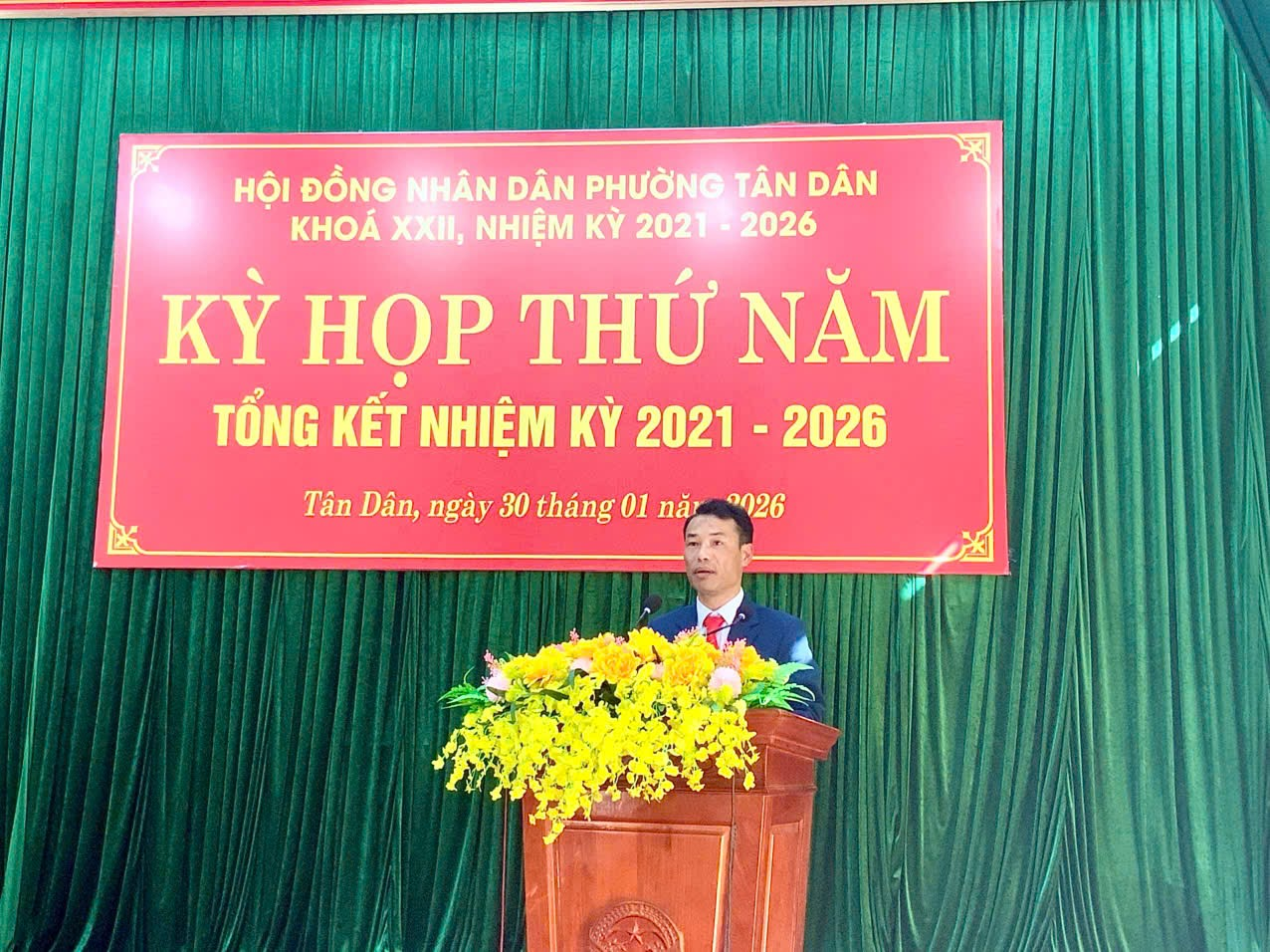 Sáng ngày 30/1, Hội đồng nhân dân phường Tân Dân tổ chức kỳ họp thứ năm - kỳ họp tổng kết nhiệm kỳ 2021 - 2026, Hội đồng nhân dân phường Tân Dân khoá XXII, để đánh giá kết quả thực hiện nhiệm vụ nhiệm kỳ 2021 - 2026 và xem xét, quyết định một số nội dung thuộc thẩm quyền Hội đồng nhân dân phường. Ông Trương Bá Duyên - Bí thư Đảng uỷ, Chủ tich HĐND phường và ông Hồ quyết Thắng, Uỷ viên Ban Thường vụ Đảng uỷ, Phó Chủ tịch Thường trực HĐND phường chủ toạ kỳ họp.