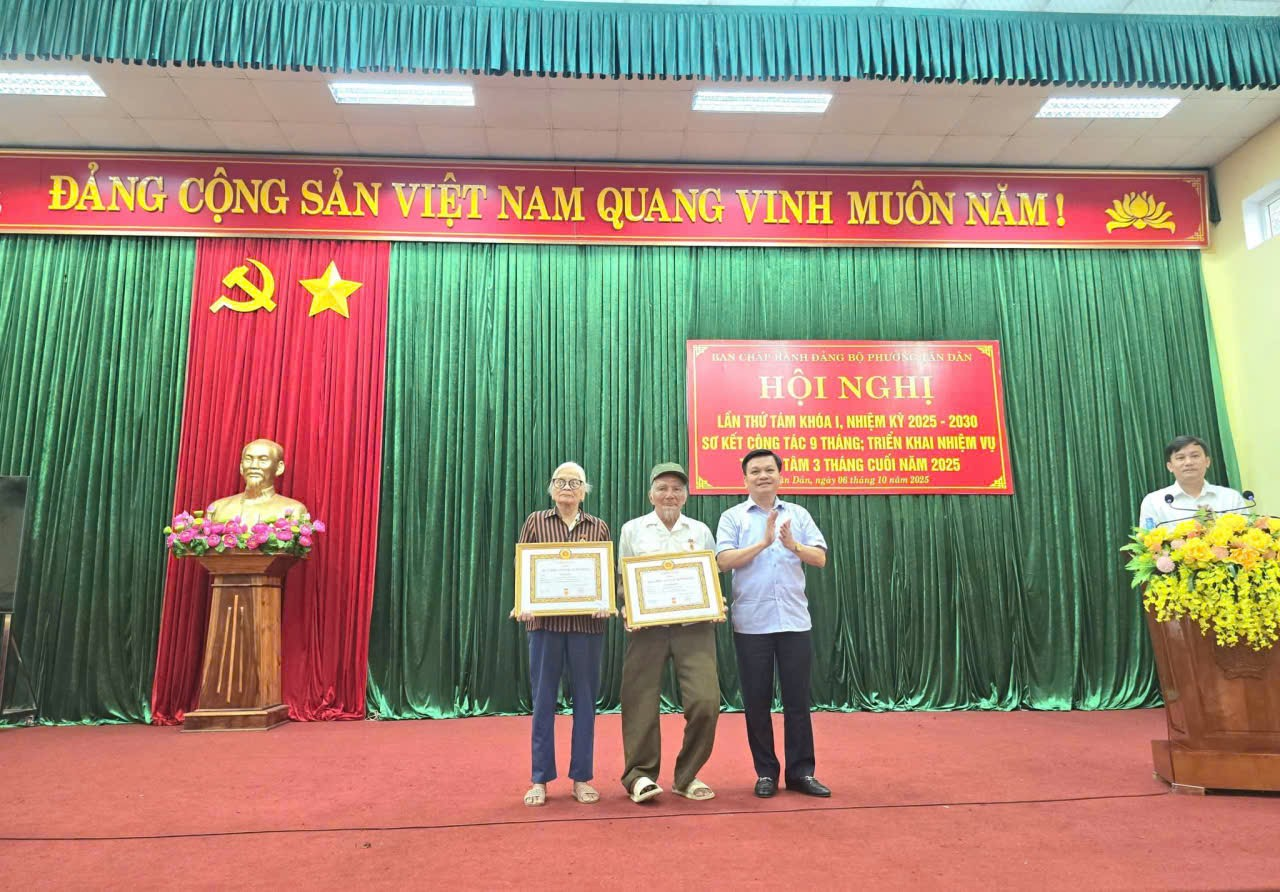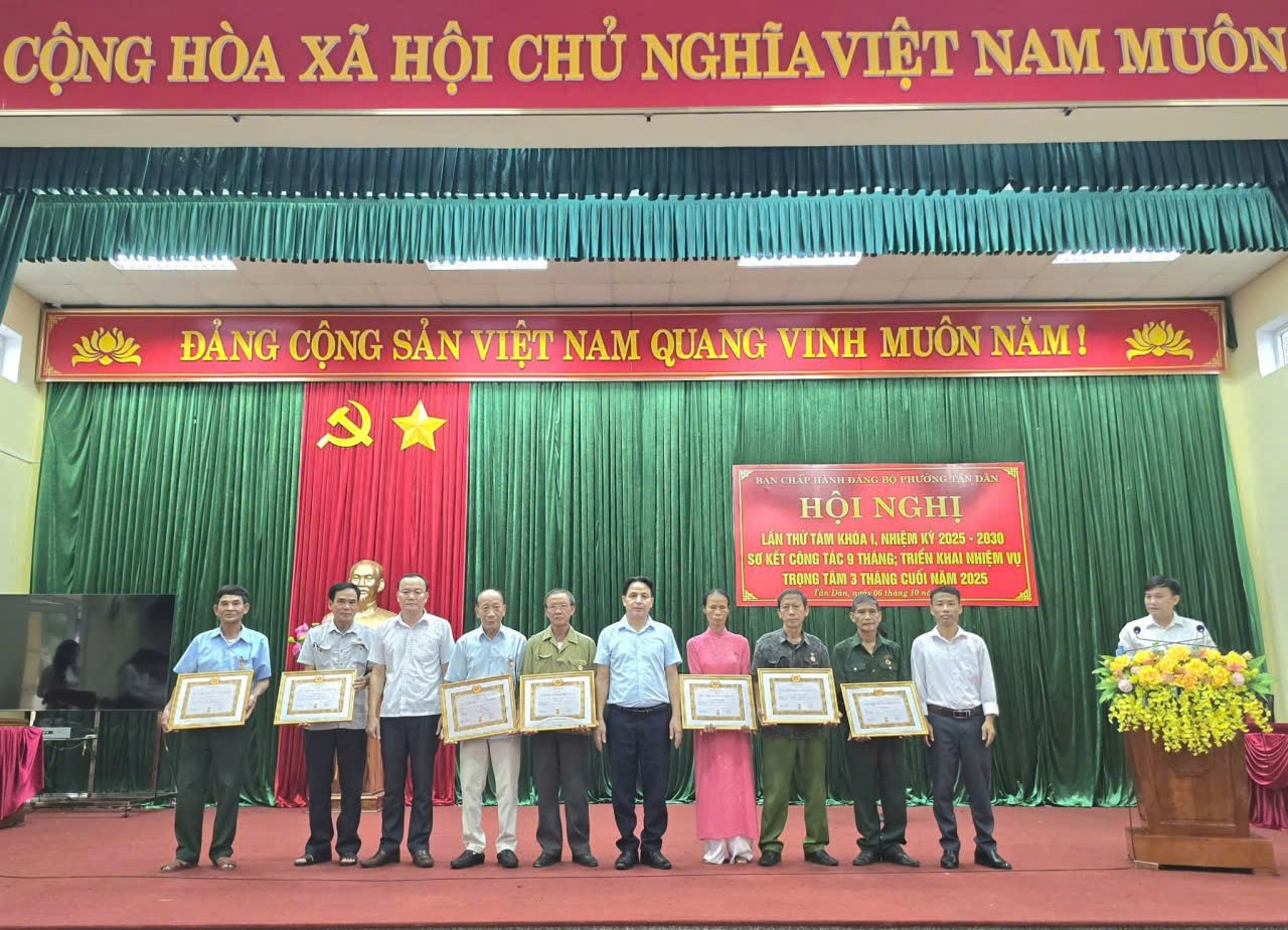 Ngày 06/10/2025. Đảng uỷ phường Tân Dân tổ chức Hội nghị sơ kết công tác xây dựng Đảng 9 tháng đầu năm, triển khai nhiệm vụ 3 tháng cuối năm 2025 và trao Huy hiệu Đảng đợt 2/9/2025 cho các đồng chí đảng viên tiêu biểu.