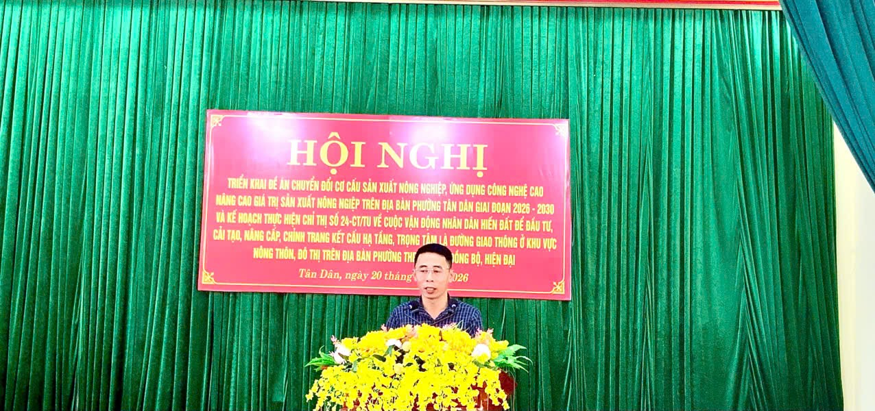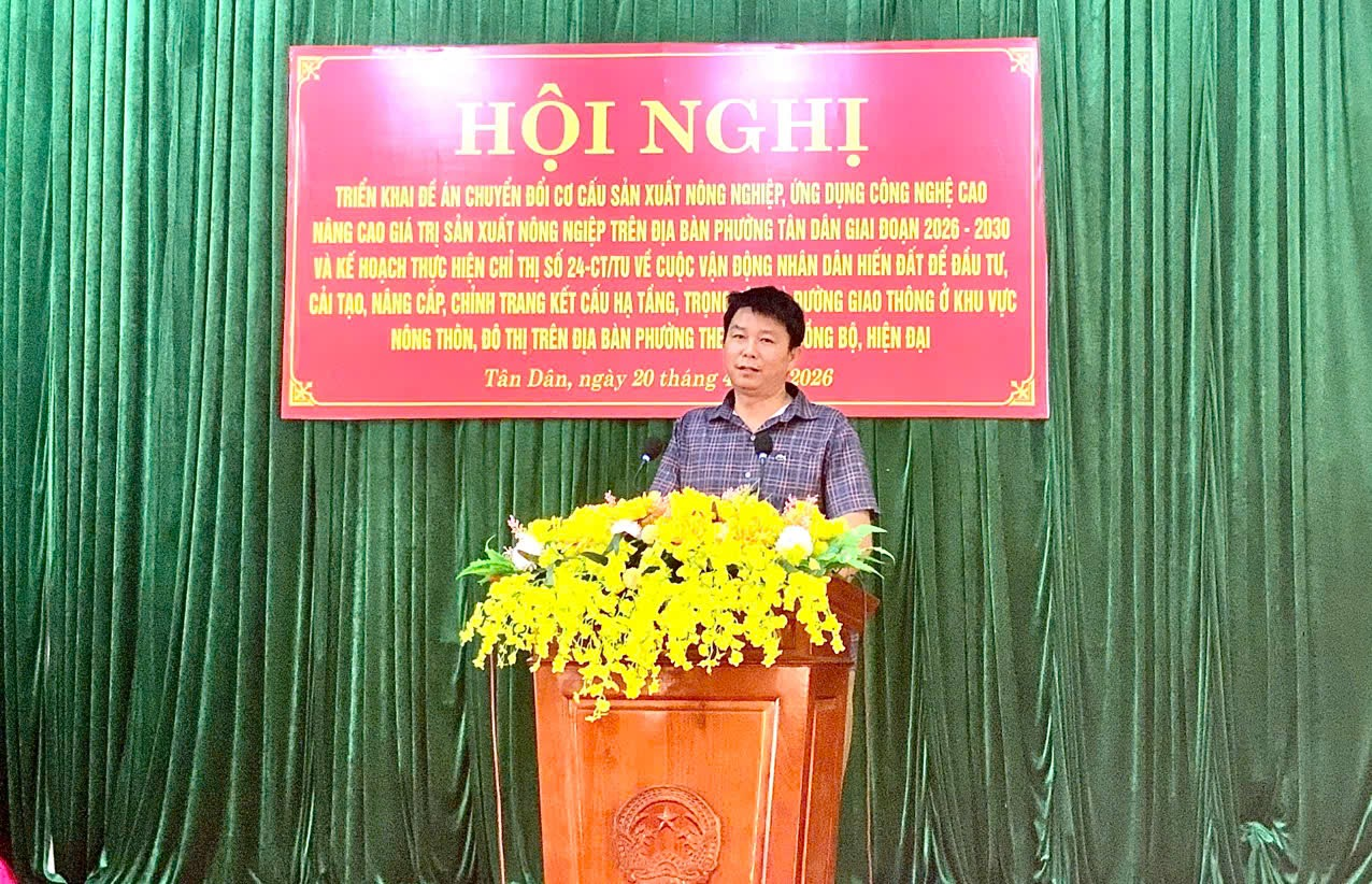 Kết luận hội nghị, Đồng chí Đậu Văn Đồng - Ủy viên Ban Thường vụ Đảng ủy, Phó Chủ tịch UBND phường nhấn mạnh việc triển khai Đề án chuyển đổi cơ cấu sản xuất nông nghiệp giai đoạn 2026 - 2030 và Cuộc vận động Nhân dân hiến đất làm đường là nhiệm vụ trọng tâm, lâu dài, có ý nghĩa quan trọng đối với sự phát triển kinh tế - xã hội của phường Tân Dân. UBND phường yêu cầu các bộ phận chuyên môn, các tổ dân phố khẩn trương cụ thể hóa nội dung Đề án và Kế hoạch thành chương trình hành động phù hợp với thực tế; tăng cường công tác tuyên truyền, vận động để tạo sự đồng thuận cao trong Nhân dân; phát huy vai trò nêu gương của cán bộ, đảng viên trong thực hiện tích tụ ruộng đất, chuyển đổi sản xuất và hiến đất mở rộng đường giao thông.
